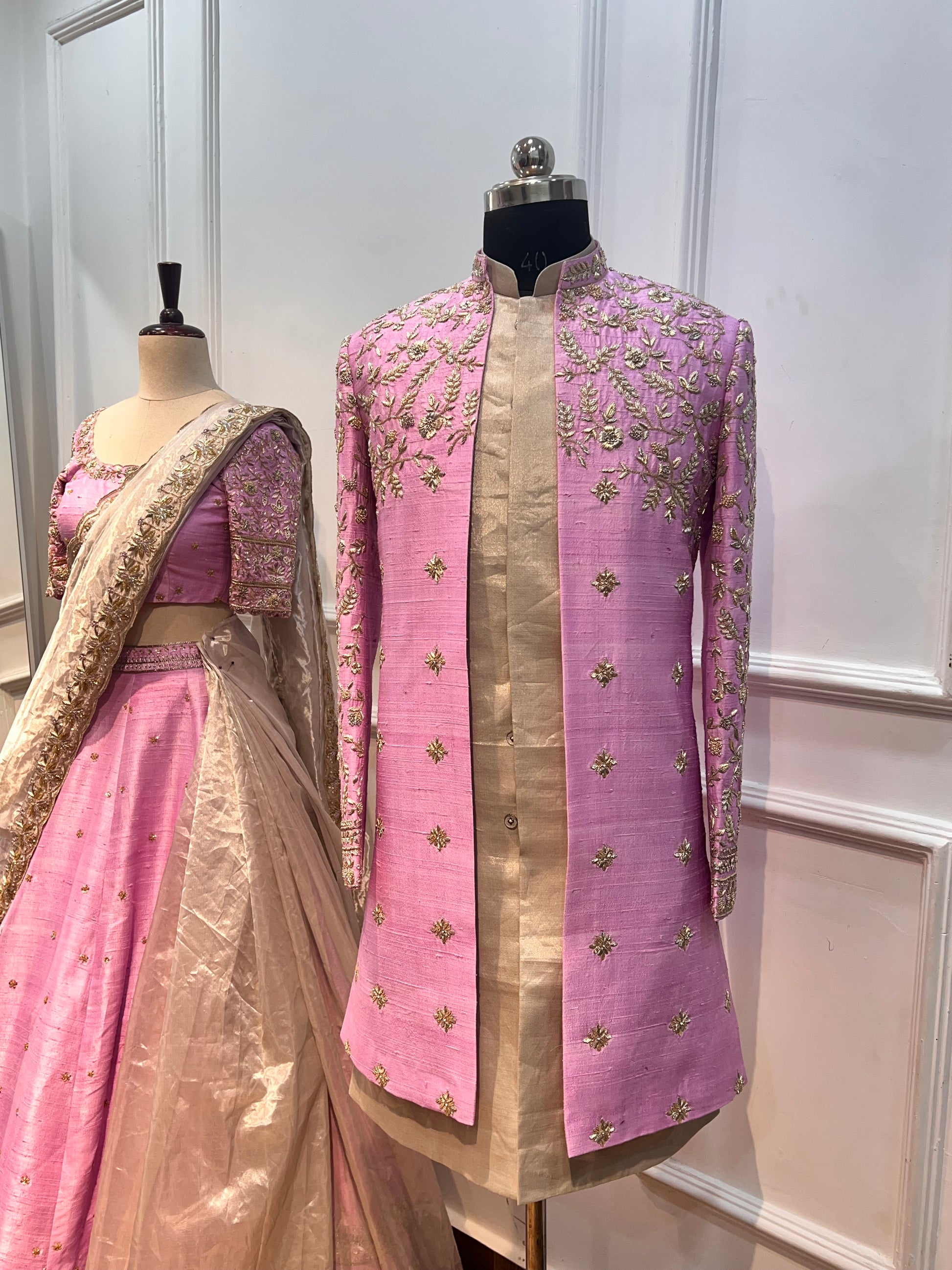Pink Raw Silk Open Sherwani with Hand Embroidery & Tissue Inner Kurta With Pants