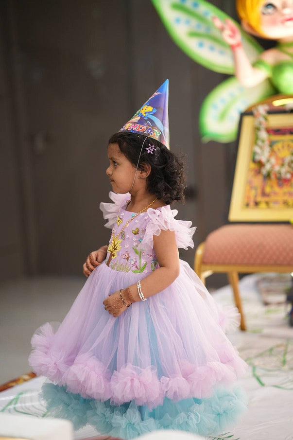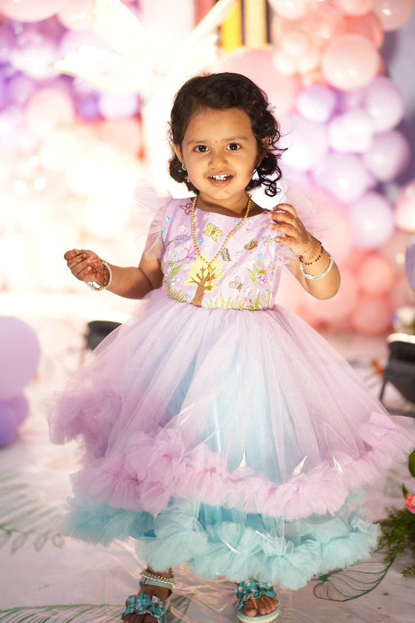 The skirt features multiple tiers of the softest net ruffles, creating a dreamy, cloud-like effect. The palette is inspired by the soft colors of a mermaid's cove: a top layer of lilac/lavender, followed by a gentle blush pink, and finished with a playful splash of seafoam green/aquamarine at the hem. Every twirl will bring the layers to life!